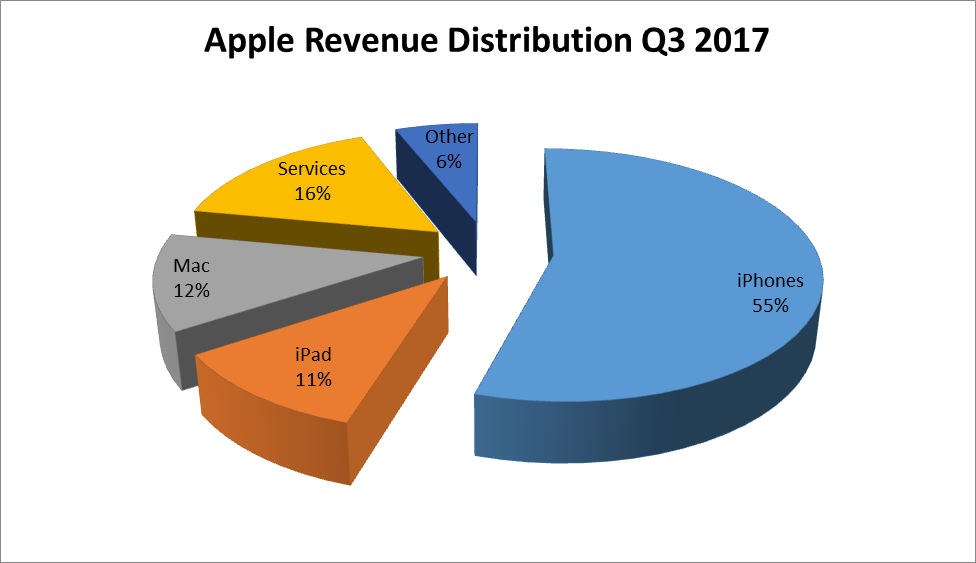 The company is still highly dependent of how their iPhones sales are going. For example, during their latest quarter (Q3 2017), the company shows 55% of its sales coming from the iconic smartphone: