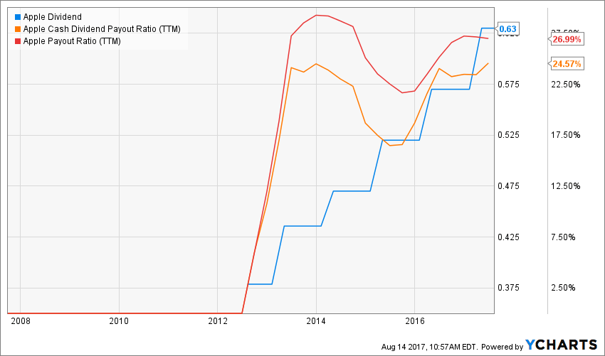 What really matters to me is the dividend growth. While AAPL dividend growth history is relatively new, it shows the kind of trend I’m looking for. With a 10.58% CAGR dividend growth rate over the past 5 years, AAPL is up to a great start to become a Dividend Achiever in no time.