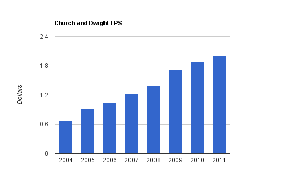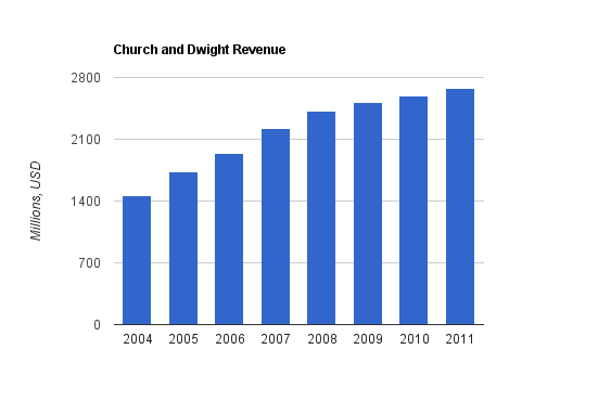 One of my first published analysis articles was of Church and Dwight. I was a shareholder of the company at the time, and published an analysis saying it’s reasonably valued, that it’s not going to make anyone rich but that it should be a steady performer over the long term, and is superior to its competitors Procter and Gamble, Colgate-Pamolive, and Clorox. As it turned out, between 2009 and 2012 the stock price doubled, so I guess I may have underestimated the “not going to make anyone rich” part. That’s a rather stellar increase for 3 years of selling baking soda and condoms.