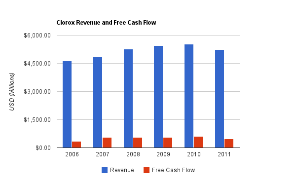 Clorox averaged 2.4% annualized revenue growth over this period, which included some restructuring. Free cash flow growth over this period was erratic and negligible; free cash flow was larger in 2007 than 2011, for example.