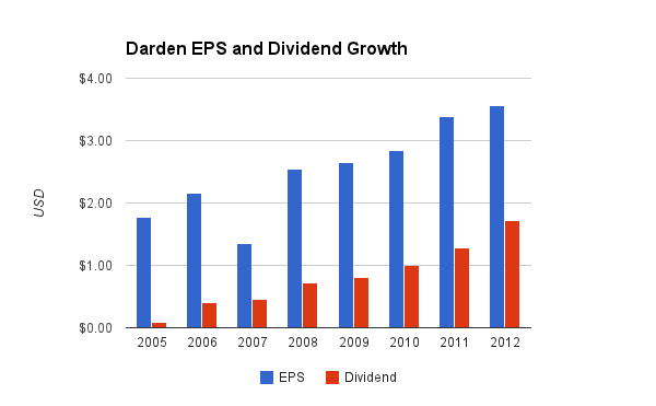 Darden management has put forth specific five year targets in the 2012 annual report. The company plans to increase sales from $8 billion in 2012 to $11-$12.5 billion in 2017, which would mean better than 6.5% revenue growth per year over this period. They also plan to increase EPS from $3.58 in 2012 to $5.75-$7.25, which would mean an EPS growth rate of 10% per year at the low end to 15% on the high end, while paying an above average dividend yield on top of that. The sum of dividends and share repurchases for the period of 2013-2017 is estimated by the company to be $2.9 billion to $3.6 billion.