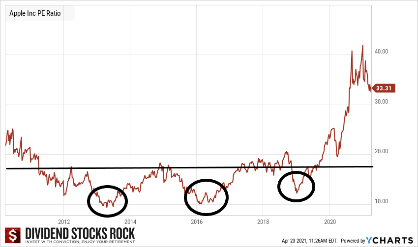 Let’s take a well-known company, Apple (AAPL), and see how its price-earnings multiple has fluctuated between April 2010 through April 2021.