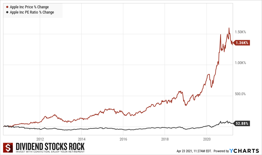 While Apple had a few rough periods, what catches our attention now is the incredible run the stock has had on the market. Over the same period, the stock price skyrocketed by more than 1,000%! Not bad for a PE expansion of “only” 53%.