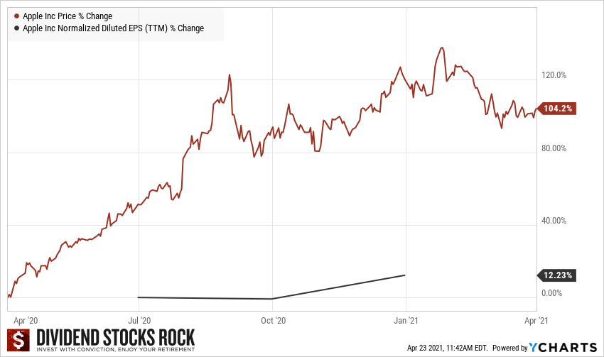 P/E expansion happens when there is hype building around a stock. This means its price goes up faster than its earnings growth. In Apple’s case, the period between April 2020 and April 2021 is a perfect example of a P/E expansion. While AAPL’s EPS grew by 12% over the past 12 months, its price more than doubled.