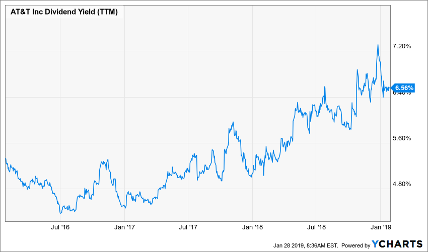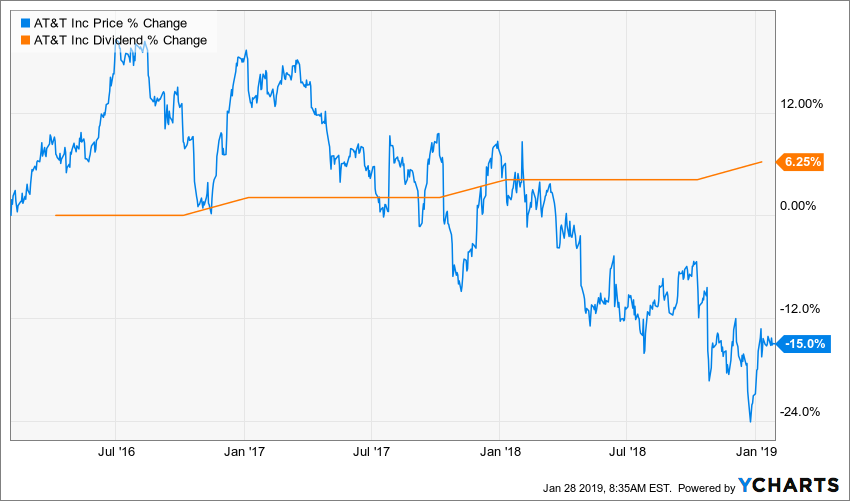 One of the best-known examples of a popular dividend yielding stock is probably AT&T (T). The telecom giant is known for its generous dividend and has rarely shown a yield under 5%. However, the reason the yield is now well above 6% is all related to a plummeting stock (-15% in the past 3 years).