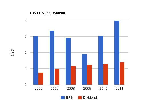 Overall, with a P/E of 12, a strong balance sheet, and good growth and dividend history, I consider ITW to be a reasonable buy for a dividend stocks portfolio at the current price of a bit under $48. However, I do not consider it to have a substantial economic moat, it is rather cyclical, and the dividend growth has slowed considerably over the last few years. I believe it would do well as a cyclical choice in a dividend growth portfolio to get sector diversification. The charts below use the trailing twelve month period as a proxy for “2011”.