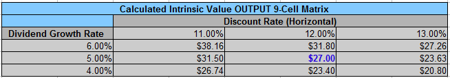 This output chart will not only tell you the fair stock value based on those inputs, but will also tell you the fair stock value based on nearby inputs. In this example, in addition to calculating the results for 5% dividend growth and a 12% discount rate, it will automatically show what the fair value is if it turns out that the stock only grows its dividend by 4%, or if you use a discount rate of 11% instead.
