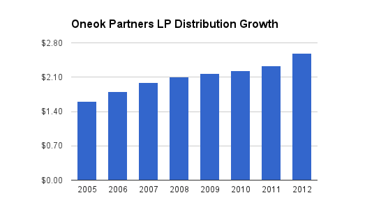 Over the seven year period ending in 2012, Oneok increased its distribution by an average rate of approximately 7.1% per year. Distribution growth was rather consistent over this period, with an increase each year. In particular, the distribution increased almost every quarter, with an exception in 2009 at the most uncertain point in the recession when the distribution was held flat for a few quarters.
