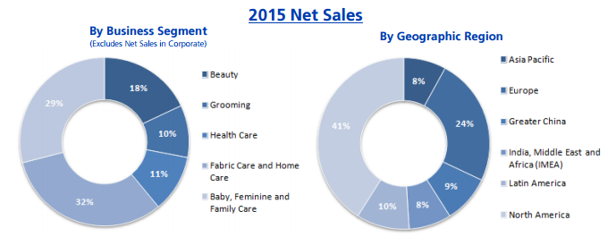 About 38% of PG’s revenues are coming from developed markets. The global economic slowdown will definitely affect this important revenue segment (in addition to the currency impact). Growth perspectives for 2016 are very limited, but the business is currently working on its profitability during this tough period. The mid term perspectives seem promising as the company will be in a very good position to tap any economic rebound with an enhanced distribution network and a better managed brand portfolio.