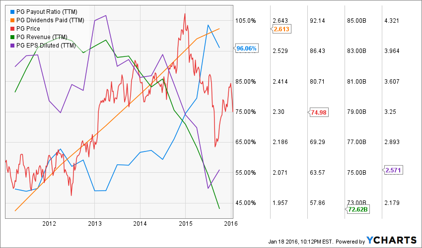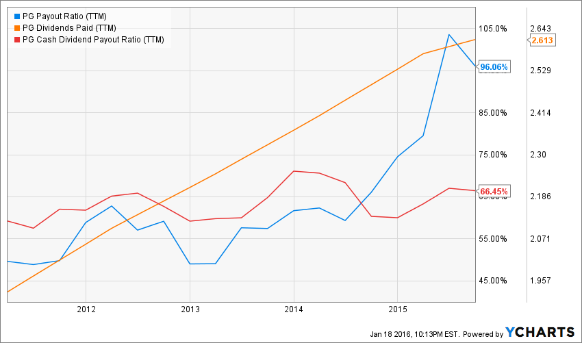 PG started to see its productivity efforts paying off in 2015 and it should continue into 2016. The company expects its EPS rising back to original post productivity plan levels in 2016 as the batteries & transitioning beauty businesses is being accounted for as discontinued operations. Therefore, we should see the payout ratio going back to a more acceptable level. PG’s dividend growth is not at risk and it will continue to pursue its path to a 60th consecutive increase. PG meets my third principle.