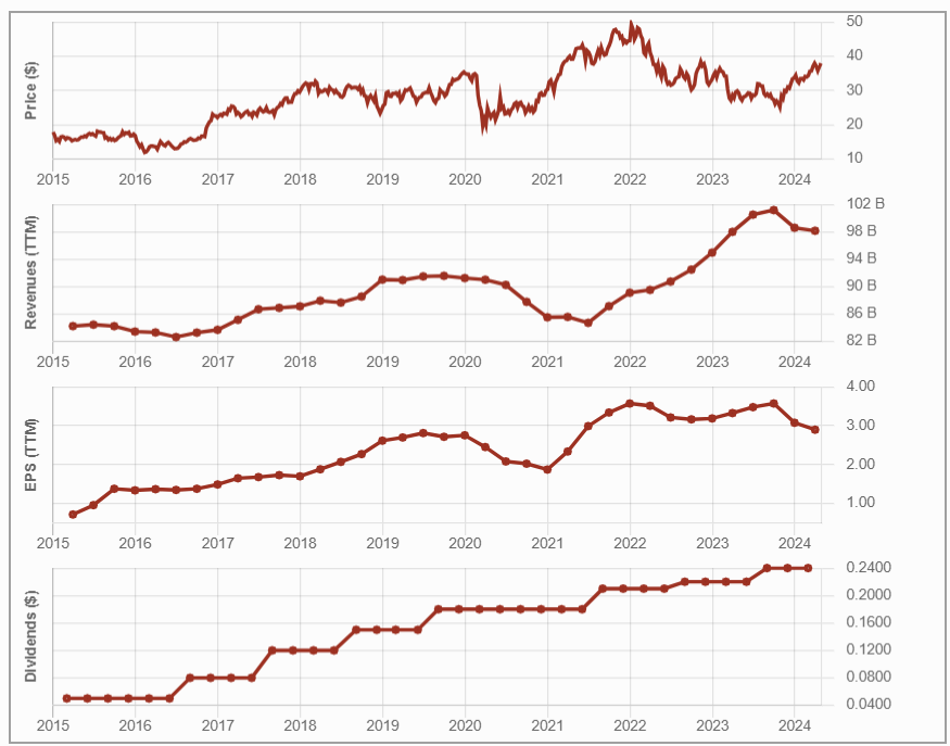 Below, we see the ten-year evolution of BAC’s stock price, revenue, earnings, and dividend payments. Notice the stock price rebound in late 2023, and slowdown in revenue and earning for 2024.