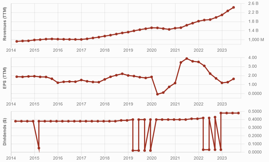 Looking at its dividend triangle, you’ll see the dividend follows an odd-looking; that’s because ARCC pays an extra $0.03/share on top of the quarterly dividend.