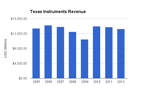 First, as baseband products became more of a commodity and Nokia decided to multisource them, Texas Instruments took a large hit, and decided to completely exit that business. They began focusing on analog, embedded, and their OMAP applications processors. But, OMAP applications processors ran into strong headwinds as well. They secured some strong design wins, such as in the Kindle Fire, but fell short elsewhere. Specifically, Samsung (the second largest semiconductor producer after Intel) and Apple are going with in-house processor designs for their products, and Qualcomm has been a stronger competitor than Texas Instruments in the remaining tablet and smart phone market. Therefore, Texas Instruments has decided to reduce their wireless segment and avoid competing with their OMAP processor space in the highly competitive smart phone and tablet markets. Instead, their OMAP processors will likely find a smaller, more profitable home in products with longer product lifecycles.