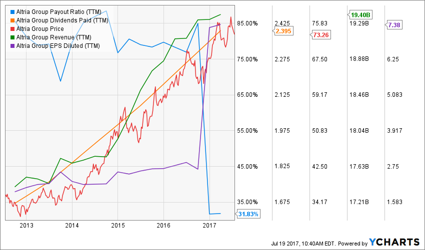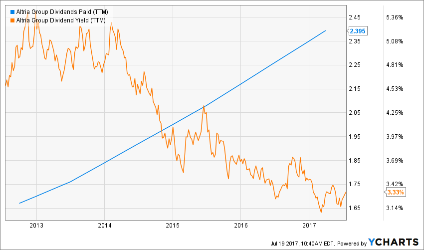 MO has always been generous with its shareholders. You can see that as the dividend grew over the past 5 years, MO yield tend to go down. This is because the stock surged by 105.78% over the past 5 years (as at July 19th 2017). At over 3%, MO remains a very interesting stock.