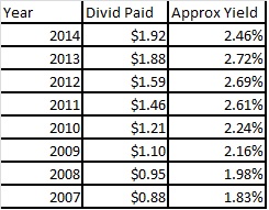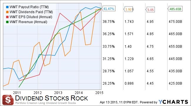 I like to use this chart to see how reliable the company’s dividend will be in the future. Since we are talking about a dividend aristocrat (over 25 consecutive years of dividend increase), I’m not too worried about WMT ability to increase its dividend. Plus, the dividend yield has become more interesting since the 2008 crash: