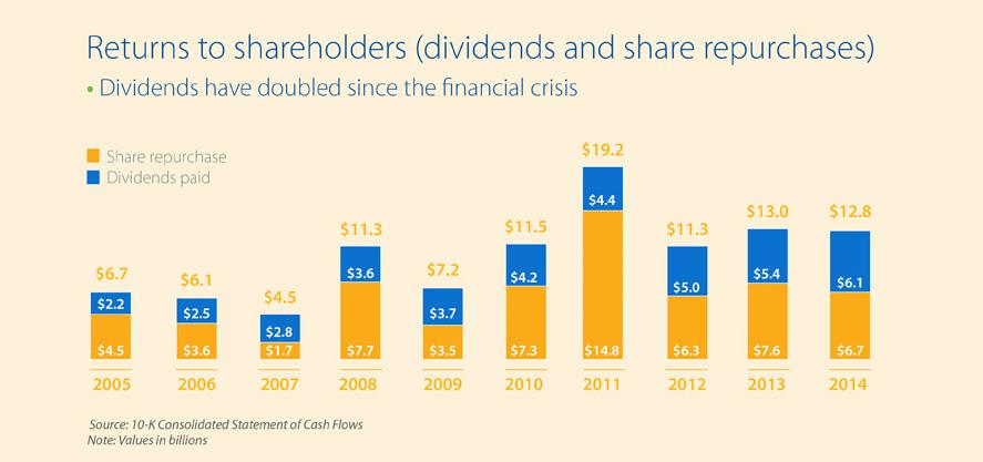 While the company is using tons of cash to buy back their shares, dividend investors are not left in the cold. This February, it was their 41st consecutive annual dividend increase. In 2015, management expects to also use 12.4 to 13.4 billion to improve both physical and digital assets and open between 35 and 39 million square feet of retail stores.