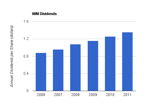 WM has avidly repurchased its own shares. Between 2005 and 2010, WM had a net repurchase of stock of about $3.7 billion. This is more than a quarter of the current market capitalization of the company. This makes EPS grow faster than net income (or in WM’s case, decrease less than net income), and fuels dividend growth (the total dividend payout has grown much more slowly than dividends per share).