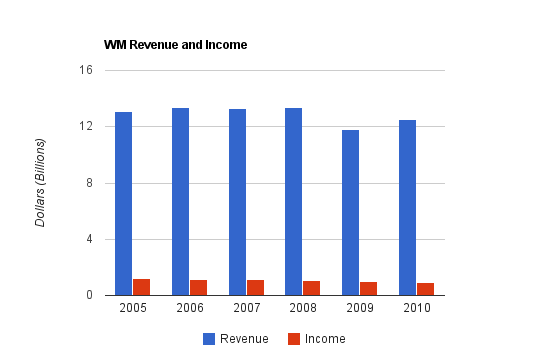 Income growth has also been nonexistent during this period. The 2010 net income is only 80% of 2005 net income. The 2010 EPS, however, is 94% of 2005 EPS because WM has been repurchasing shares.